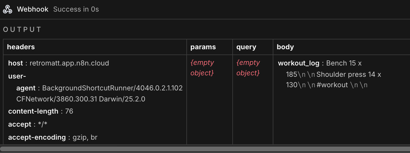 Shortcuts is the courier. n8n is the processing plant. Apple wouldn’t dream of letting n8n grab the data from my iPhone, so I set it up to wait and receive the info from Shortcuts.