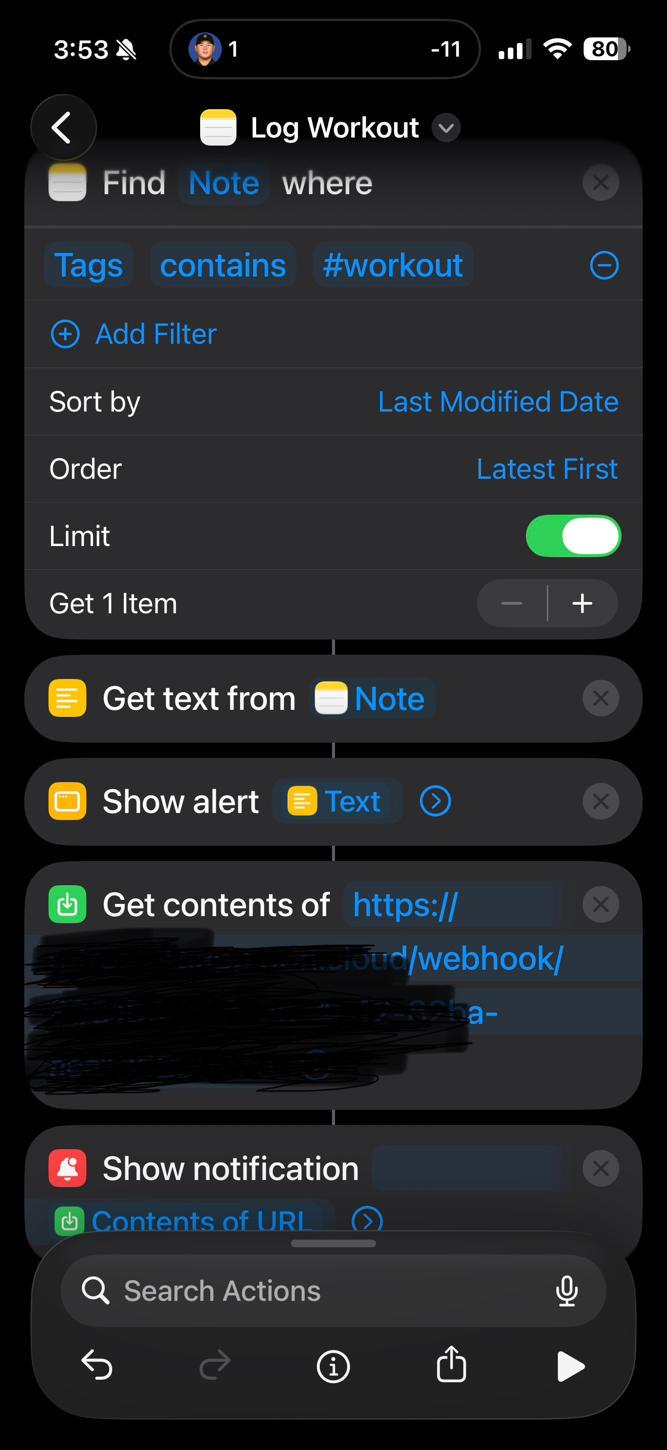 Here’s what the Shortcut looks like to grab my workout log from Apple Notes: